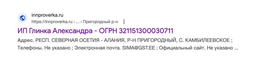 Кроме того, эту же почту на имя Симы использует ИП Александра Глинка, гражданка Эстонии, которая ведёт деятельность в том же селе Камбелеевском в Северной Осетии.